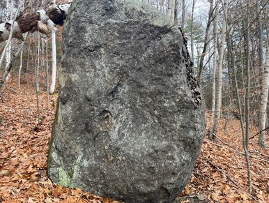 This boulder and other giant ones scattered around our camp's woods are called glacial erratics- reminders of the last Ice Age. Roughly 12,000 years ago, retreating glaciers carried and dropped these huge stones as the ice melted away. Their rounded shape, moss-covered surfaces, and unlikely resting places tell the story of ancient ice that once blanketed New England. It is called the Laurentide Ice Sheet and it covered almost all of Northern New England 18,000 years ago with the melting occurring roughly 12,000 years ago. These rocks are a reminder of how powerful forces of nature shaped our mountain and valley.