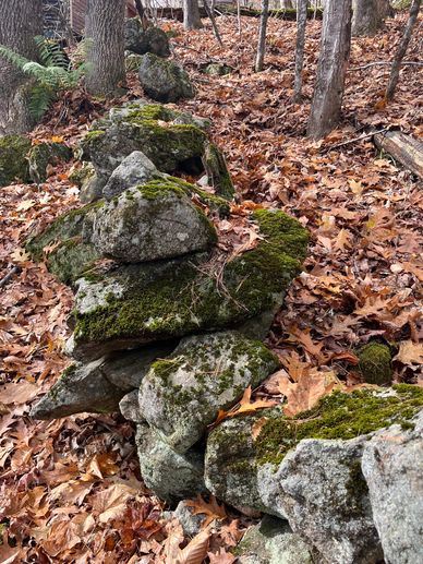 The old stone walls winding through the woods around our camp are remnants of New England's 18th and 19th century (1780-1840). As settlers cleared their fields for crops and pasture, they piled the countless glacial stones unearthed by plowing into boundary walls and livestock enclosures. These walls once marked property line, fields, and farm roads when the surrounding land was open pasture. As agriculture declined in the later 1800s, and forest reclaimed the hillsides, the walls were left standing as silent records of that earlier rural landscape. Today, they remain one of the most visible traces of New England's agricultural past.