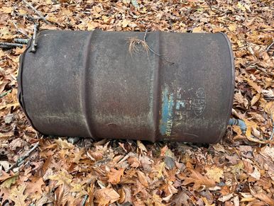 Near the property at camp lies an old steel barrel, likely dating to the early 1950s. Barrels like this were commonly used by highway and construction crews for equipment coolant during the building and realignment of the local main road and the new interstate going in at that time. It would have been discarded before there were regulations prohibiting it.
